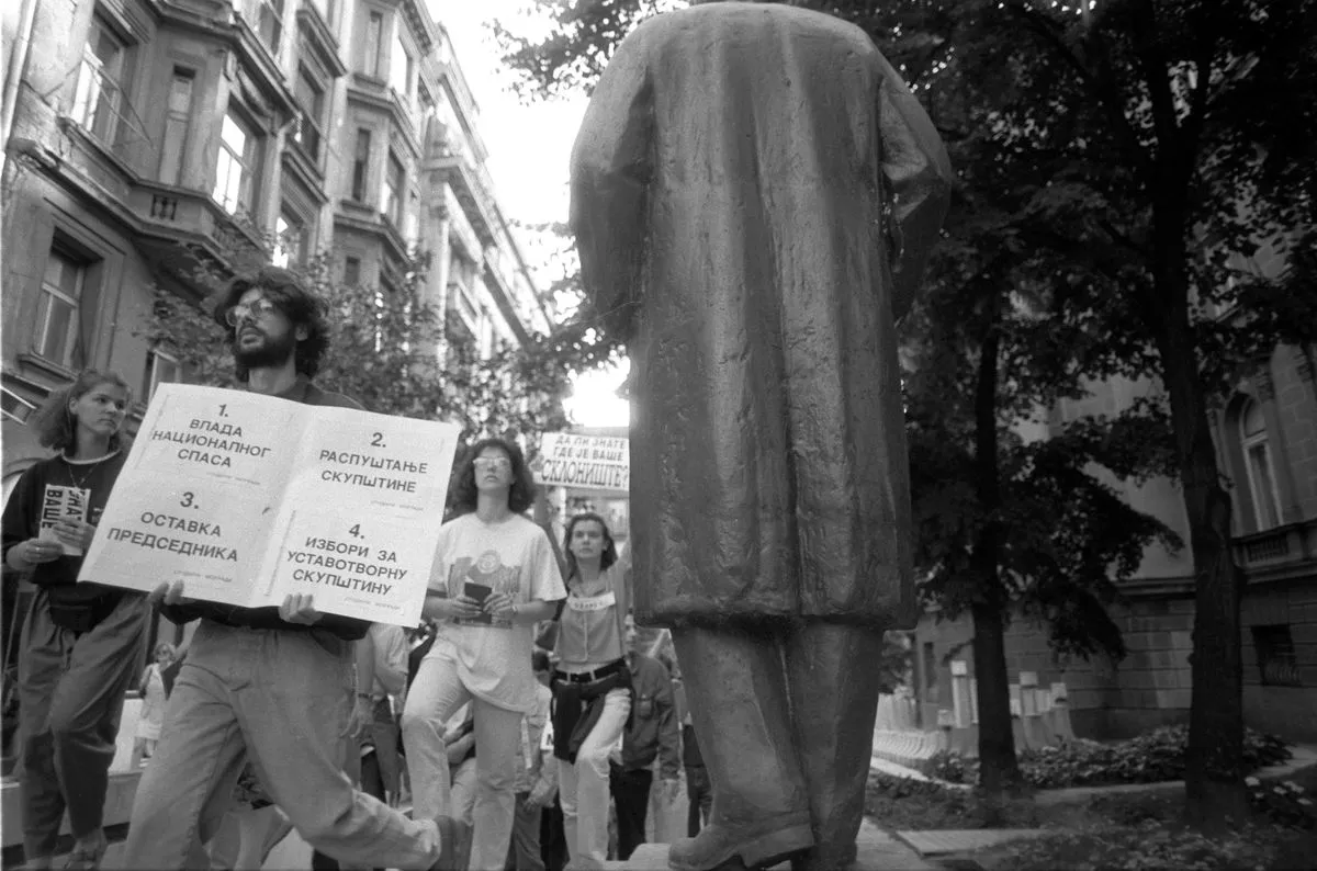 In one of Goranka Matić's photographs, two young men hold open student indexes, partially covering their faces. These booklets, containing personal information and grades, are essential to every student in Serbia. Captured during the 1996/97 protests against Slobodan Milošević's regime—when Serbia was still part of the Socialist Republic of Yugoslavia—the image could just as easily have been taken today. Four months into ongoing student protests, sparked by the collapse of the railway station canopy in Novi Sad that claimed 16 lives and seriously injured one other person, a new generation is once again on the streets, demanding accountability and an end to the corruption that led to this tragedy.