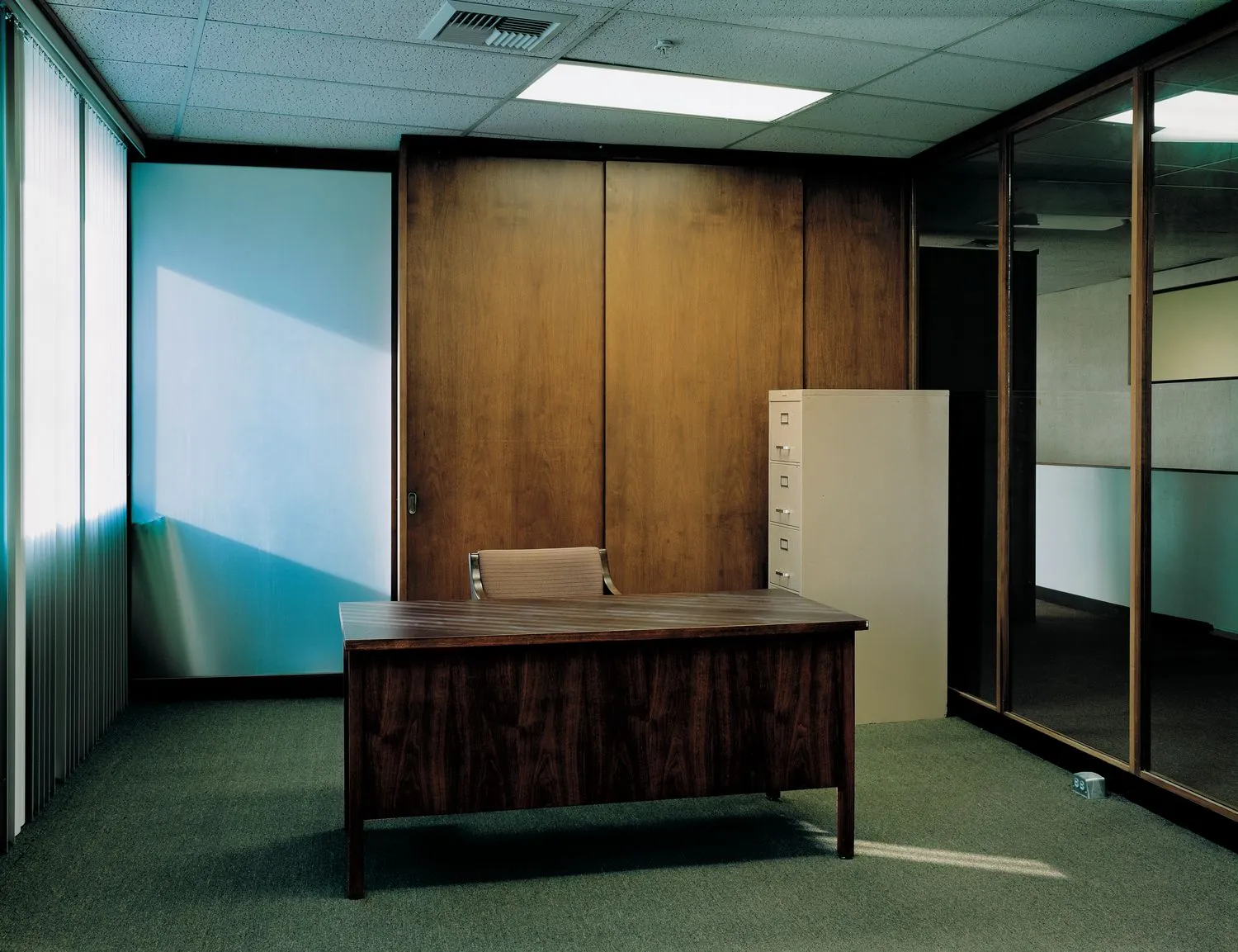 Office reveals these spaces–considered "the most common – but closed and secretive – place in the Western world," by Tunbjörk–in their absurdity, where PCs, rolls of papers, furniture, and other office paraphernalia are their main protagonists, with humans appearing sporadically, as unwilling masters of this gray, bureaucratic realm.