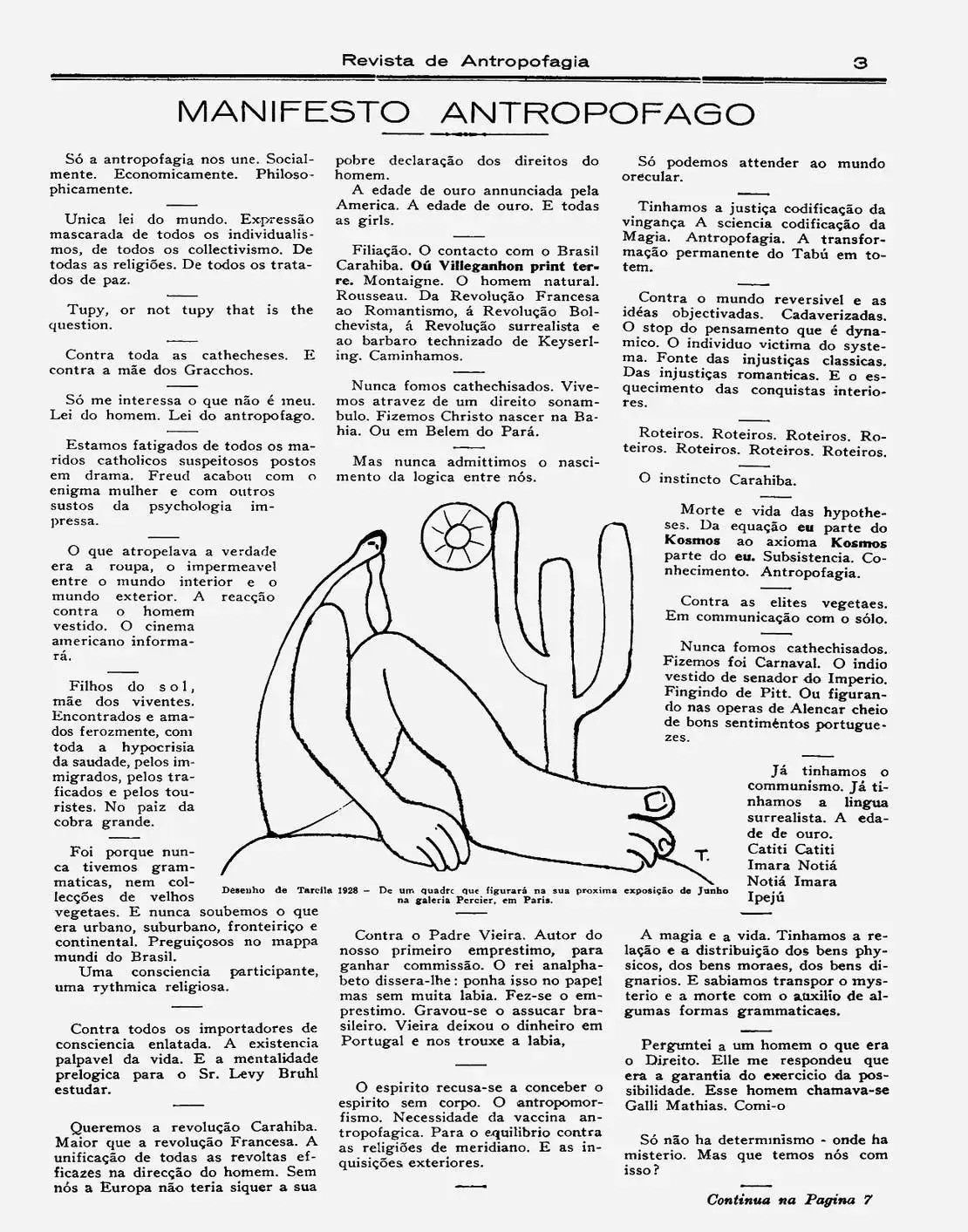 One of the most famous declarations in the manifesto, "Tupi or not tupi that is the question," carries a double significance. It mentions the Tupí Indians, known for their ritualistic cannibalism—they ate their enemies believing that would give them strength—and also plays on the famous Hamlet's soliloquy. In itself, the phrase becomes the manifestation of cultural cannibalism Andrade propagated.